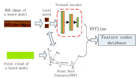Since the shape of the plank itself is mainly a large rectangular plane, with symmetrical regularity, the corresponding characteristic parameter information of different points on a single plank is the same or similar. Pointpair features alone cannot complete the uniqueness of the plank feature matching, so the feature of the local image patch of the point-pair was added here. We input the intercepted local image patch into the previously trained encoder, where the encoder only needed to take the encoding part of the original convolutional encoder, the feature vector corresponding to the input local image patch can be obtained, and the feature vector of all non-repetitive point pairs of the local image patch can be combined with the point pair feature geometric information.