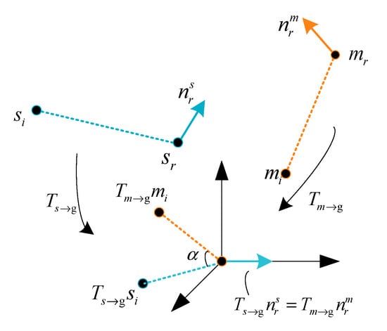 We used a local coordinate system to vote in a two-dimensional space to determine the pose here proposed by Drost et al. [7]. We selected a reference point in the scene point cloud to form a point pair with any other point in the scene then calculated the feature value according to Formula (6) and searched for the point pair in the feature code database through Formula (7). Successful matching indicates that feature point is extracted in the scene, where there is a point corresponding to it in the feature code database. We put them in the same coordinate system, as shown in Figure 9. Next, we moved these two points to the origin of coordinates and rotated them so that their normal vectors were aligned with the x-axis. Among them, the transformation matrix that occurs on is , the transformation matrix that occurs on is , and, at this time, the other points of their point pairs and are not aligned, and these need to rotate the angle to achieve alignment, with the transformation matrix is , which then becomes the following [7]: