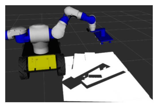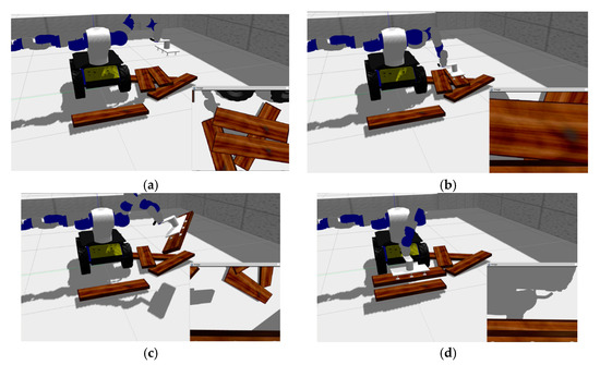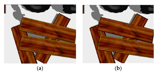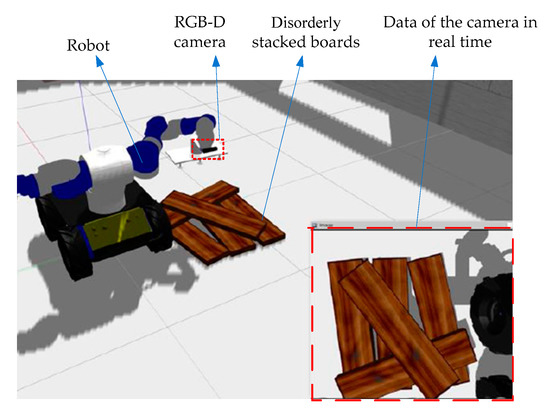 The computer hardware conditions used in the experiment were an Intel Xeon W-2155 3.30 GHz CPU, 16.00 GB of RAM, and a NVIDIA GeForce GTX 1080 Ti GPU. The whole framework is based on C++, OpenCV, Point Cloud Library (PCL) and other open source algorithm libraries. A visual grasp scene model of stacked wooden planks was built on the ROS (robot operating system) with the Gazebo platform. As shown in Figure 11, the RGB-D camera (Xtion Pro Live, Suzhou, China) is fixed at the end of the robot arm and the disorderly stacked wooden boards to be grasped are placed below. Besides that, the robot hand device is a suction gripper with six suction points.