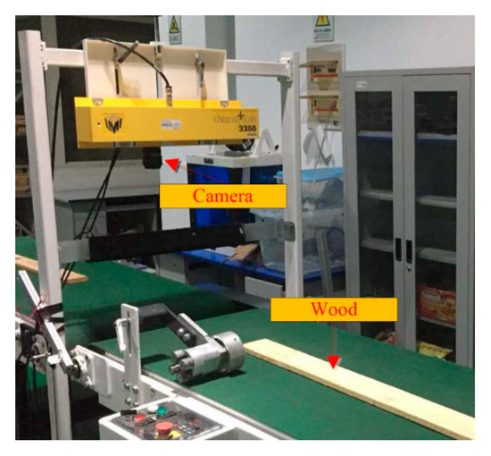 For setting up the data set, we used the self-developed mechatronics equipment to collect the images of wood boards (Figure 12). This device mainly includes a strip light source, a transmission device, a CCD industrial camera (LA-GC-02K05B, DALSA, Waterloo, ON, Canada) and an photoelectric sensor (ES12-D15NK, LanHon, Shanghai, China) mounted on top. When the conveyor belt moves the wood board to the scanning position, the photoelectric sensor will detect the wooden board and start the CCD camera to collect the image of the wood board surface. We collected 100 images of red pine and camphor pine planks (Figure 13) and eventually divide them into small pieces of about 8000 local images (Figure 14).
