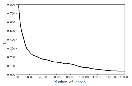 The network training used the deep learning autoencoder model designed in this paper. The structure size of each layer is shown in Table 1. The encoding stage contains four convolutional layers, and the decoding stage contains four transposed convolutional layers. The neural network training adopted the form of full batch learning, where the epoch is 160, and the relationship change curve between the training error and iteration number is shown in Figure 15. When the number of epochs was less than 20, the loss value of the network model decreased faster. When the number of epochs was more than 20, the loss value of the network model decreased slowly. When the epoch was 120–160, the loss value of the network model remained basically stable, that is, the model converges. Through training the network model, a 32-dimensional local texture feature descriptor of the wood plank that was stable enough for viewing angle changes was finally obtained. During the experiment, four feature dimensions of local image patches (i.e., 16, 32, 64, and 128) were specifically tested, and recognized 600 planks with different poses. We used the final pose to meet the pose accuracy of the plank to be grasped as the correct pose for recognition. We calculated the recognition rate and pointpair matching time to evaluate the performance of these four feature dimensions, as shown in Figure 16. With the 16-dimensional, 32-dimensional, 64-dimensional, and 128-dimensional feature dimensions increasing sequentially, in other word, the feature expression code was more abundant, so the recognition rate of the wood plank gradually increased, i.e., increases of 83.2%, 95.6%, 95.9%, and 96.4%. After the feature dimension size reached 32 dimensions, the recognition rate was not significantly improved. An increase in feature dimension size was also accompanied by an increase in computing time. When the feature dimensions were 64 dimensions and 128 dimensions, the calculation time of the plank pose increased even more. Considering the recognition rate and computing time, the 32-dimensional local image feature descriptor of the wooden plank was finally selected.
