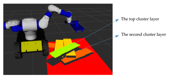 The robot first grasps the top plank of the stacked plank. The original point cloud visualization result of the stacked plank scene under the RGB-D camera using the Rviz tool is shown in Figure 17. Combining the Euclidean distance clustering method [41], the point cloud under the camera was divided into different areas, so that different planks correspond to different point cloud clusters. The visualization result using the Rviz tool is shown in Figure 18. The cluster with the smallest average depth value was confirmed as the current priority grasping area, and the point pair matching was completed using the aforementioned method based on pointpair features and local image patch features. Then, we performed pose voting and clustering and finally determined the pose of the plank to be grasped.