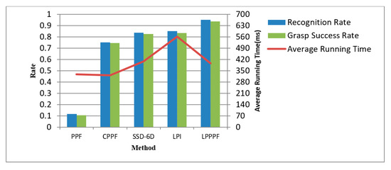 We carried out a grasping experiment 1000 times on randomly placed wooden planks in stacked wooden planks piles, also using other methods to perform the same number of experiments, and then compared the recognition rate, average recognition time, and grasping success rate. If the positioning accuracy of the recognition result is less than 3 mm and the rotation angle error is less than 2°, this situation is good for grasping success. This positioning accuracy is regarded as the correct recognition. As is shown in Table 2, the corresponding recognition performance comparison is shown in Figure 16, where “PPF” [7] was the traditional point pair method; “CPPF” [14] used the pint pair feature added color information. “SSD-6D” [17] used the convolutional neural networks for end-to-end training to obtain the pose of an object. “LPI” only used the local image patch proposed here to match the feature points and ICP calculated the pose, and did not use the point pair method to match; “LPPPF” is a method we proposed to determine the pose based on the local image patch combining point pair feature matching feature points, pose voting, and clustering.