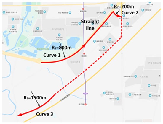 The experimental conditions that had to be satisfied were as follows: road surface is properly attached, lane markings are clear, longitudinal gradient is less than 5%, lateral wind speed is less than 2 m/s, and traffic volume of selected experimental route is not too large. The route selected in the experiment should be a representative road, including straight sections, curves with small curvatures and large curvatures. The experimental route includes straight sections and curves with radii of 1500, 800, and 200 m. Table 1 lists the detailed experimental conditions. Figure 2 shows the four test sections selected in the experiment. For the test distances of the straight lane, curves with radii of 800 and 1500 m were selected for the 800-m test distance, and the curve with radii of 200 m had a test distance of 400 m. In order to ensure the continuity and authenticity of the test data, considering the sampling frequency of the eye tracker and CAN data, the test time of the driver should not be less than 10 s. Therefore, we determined the test time range shown in Table 1 according to the length of the test section and the driving speed. In addition, since we do not consider following, lane changing, overtaking, etc., it is necessary to ensure that no other vehicles interfere with the driver’s driving during the test period. For the uncertainty of traffic, driving tests needed to be repeated 2–3 times under each experimental condition. Each effective experiment must be carried out without interference from other vehicles. If there is interference from other vehicles during the experiment, we should discard this dataset and perform the experiment again.