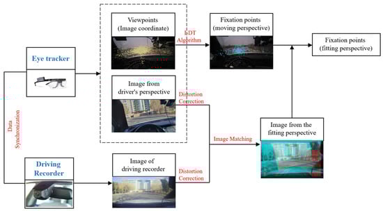 The data collected by the eye tracker include eye movement data and forward-looking images. The eye movement data include the set of viewpoints from the perspective of the driver. The desired fixation points are our focus. So, we should separate the fixation points from the viewpoint dataset first. In addition, forward-looking images were collected to obtain the locations of the fixation points in the image coordinate system. For this purpose, it is necessary to correct the distortion of the collected images. Further, because the images collected by the eye tracker move with the head movements of the driver, image matching must be performed to obtain the fixation points of the driver under a fixed perspective. Figure 3 shows the details of the data processing.