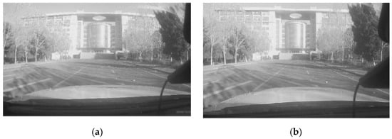 The fixed position camera is installed parallel to the vehicle axis, and there is no rotation in the yaw direction during coordinate projection—that is, the parameters and in Equation (27) are both 0 and the equation can be rewritten as