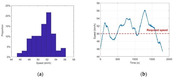 (a) The distribution of speed and (b) the speed curve of subject 1 on a straight lane; the required speed is 50 km/h.