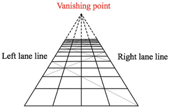 In addition, the fixation points during driving should be distributed below the vanishing point, defined as the intersection point of the left and the right lane lines in the image acquired by the camera and the end point of the road in the field of vision, as shown in Figure 8. When the calculated vertical height of the corrected fixation points is less than the vanishing point height and these points are located in the current lane, the preview of the driver falls on the driving road (i.e., the driver has reasonable preview behavior); fixation points higher than the vanishing point are discarded as invalid data.