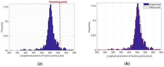 Fixation point distribution of subject 1 on a straight lane at 50 km/h: (a) vanishing point test and (b) fitting of distribution curve.