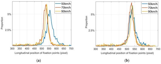 We took the experimental data of subject 1 in a straight lane as an example to study the fixation point distribution. By quantifying the longitudinal distribution of fixation points and taking 10 pixels as the statistical interval, we obtained the statistical distribution map of the fixation point of subject 1 at a speed of 50 km/h on a straight lane, which is close to the normal distribution shown in Figure 9. In order to obtain a more objective evaluation, the Jarque–Bera method, which is based on the skewness and kurtosis of data, was used to test the normality of the fixation point distribution. The Jarque–Bera test is a test for the goodness of fit of the sample data with the skewness and kurtosis consistent with the normal distribution. The statistical test results are always non-negative. If the result is much greater than zero, it means that the data do not have a normal distribution. In statistics, a normal statistic with a critical value of 0.05 is generally used as the test standard. Jarque–Bera statistics are calculated as follows [35]: