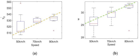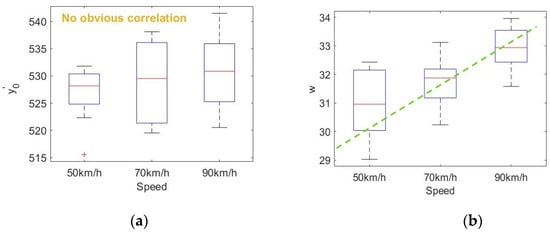 First, the influence of speed on the fitting data of the fixation point distribution is determined. Taking a curvature radius of 800 m as an example, the fixation point distribution parameters under different speeds are fitted. Figure 12 shows the relationship between the fitting parameters of the fixation point distribution and the vehicle speed for a curve with R = 800 m. No significant difference was seen in at each speed, and the correlation coefficient with the vehicle speed was 0.2499, which does not indicate an obvious correlation. The difference in at each speed was obvious and showed an obvious linear correlation with the vehicle speed. The correlation coefficient was 0.6472 (p ≤ 0.05), and the specific relationship was
