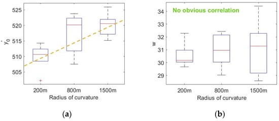 Next, the influence of the curvature radius on fitting parameters is analyzed. Figure 13 shows the relationship between the fitting parameters of the curve distribution and vehicle speed for different drivers at the same speed and different curvature radii. The difference in was obvious at each speed. The correlation coefficient between and radius of curvature R was 0.5939 (p ≤ 0.05) after removing the abnormal fitting data of the curve with R = 800 m. Relevant studies have found that the logarithm of the radius of curvature can better reflect the road curvature directly perceived by drivers [29]. The logarithm of curvature radius will not change the relationship between the properties and parameters of the curve radius, and it can eliminate the heteroscedasticity through logarithmic transformation and increase the correlation between variables, which can better reflect the driver’s visual statistical law in curve driving. The correlation coefficient between and the logarithm of the radius of curvature was 0.7210 (p ≤ 0.05), indicating a significant linear correlation, and the specific relationship was