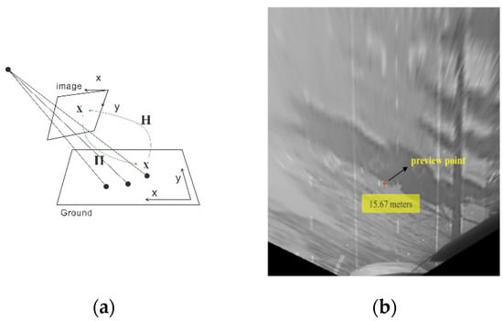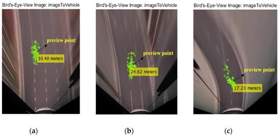 where is the preview point in the image coordinate system and is the fixation point projected into the world coordinate system. Figure 14 shows a schematic diagram of the bird’s-eye projection and a preview point projected by this method. In Figure 14b, the preview point is 15.67 m in front of the driver.