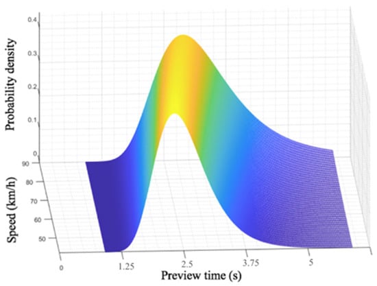 Combining Equation (29) for the preview time with Equations (19) and (22) for the distribution function of the fixation points for a straight lane and curves, respectively, the probability distribution of the preview time under different speeds and different conditions can be calculated, and a driver preview model suitable for all driving conditions and driving speeds can be obtained. Figure 16 and Figure 17 show the probability density map of the preview time on a straight lane and curves, respectively, at different driving speeds. It should be noted that the preview models in Figure 16 and Figure 17 are applicable to straight roads with a driving speed of 50 to 90 km/h and curves with a curvature range of 200 to 1800 m. That is, driving at medium and high speeds under relatively common straight and curved conditions can be applied to many common traffic scenarios, such as urban expressways and highways. For driving scenarios with higher speeds and with curves with smaller radii of curvature, such as highways and mountain roads, a specific experimental analysis should be carried out in subsequent studies.