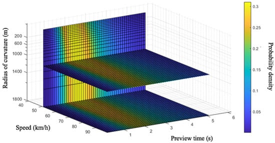 It can be seen from Figure 16 that, at different speeds, the driver’s preview time is distributed in a fixed area, and the preview time increases with the vehicle speed. At the speed of 50 km/s, the peak of the preview time appears at 2.21 s. Likewise, the peak of preview time appears at 2.48 s at 70 km/h, and 2.89 s at 90 km/h. However, it is noteworthy that even the weights of these peak points are not large in absolute value—that is, the driver does not rely on an utmost accurate preview point in the process of visual recognition of the road. Interval preview is an important feature of the driver’s visual perception, and as the vehicle speed increases, the weight of the peak decreases. As showing in Figure 17, when driving on curves, both the vehicle speed and the road curvature radius have an impact on the driver’s preview time distribution. Their impacts are reflected in different aspects. The vehicle speed affects the dispersion degree of the preview time’s weight distribution. The higher the vehicle speed is, the lower the weight corresponding to the peak value of the probability density is. The radius of curvature affects the length of the preview time. The average preview time will decrease as the radius of road curvature decreases.