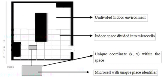 This paper proposes a deep learning approach to the positioning of a VI user in an indoor environment with a smartphone as inertial guidance. Each room is given a room identifier. The indoor area is divided into microcells, each of which is assigned with a unique region/place identifier that acts as a recognition layer. The vertex of each microcell has 2D (x, y) local coordinates. Figure 1 shows the representation of a sample floor plan that has undivided and divided areas. The solid black lines represent the walls of the indoor environment, and the obstacles in the rooms are represented as solid filled rectangles. The indoor space is divided into grids of cells, as depicted in the lower part of the Figure. The shaded grey rectangle is a unique microcell with 4 vertices. The local coordinates are allocated manually and are stored for each vertex in the building, resembling the latitude and longitude used in a GPS.