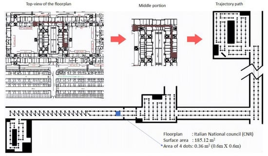 The dataset was created on the first floor of the Institute of Information Science and Technologies (ISTL), inside the Italian National Council (CNR) building. The dataset covered movements on a surface measuring 185.12 m2. Figure 3 depicts the overall map of the building with the top view and trajectory path []. The top left corner of the Figure is the top view of the floorplan. The middle portion of the Figure is the highlighted corridor of the given floor.