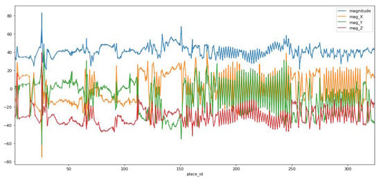 Our work focuses on the magnetic field signals of the accelerometer and gyroscope of the smartphone. Figure 4 represents the graphical representation of values from the x, y and z-axis of a magnetometer. The normalized magnitude Mmag of the magnetometer is calculated by Equation (1).