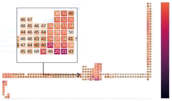 Figure 5 shows the magnetic field heatmap in each location on the trajectory of the corridor, followed by user 1. The number represented in each cell of the grid on the heatmap is the normalized magnitude, as evaluated in Equation (1). The value of the magnitude varies from 21 to 68 for the given dataset. The indoor magnetic field may be distorted over time locally because of the steel-reinforced concrete in the structures. However, the study in [] reveals that the magnetic field’s distortion pattern remains static.
