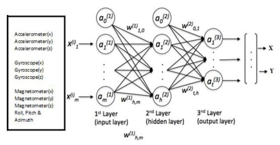 In this case, the inputs of the MLP correspond to the 3-axis inertial sensor measurements. The output layer delivers the coordinates of a point in two-dimensional space: x and y. Figure 6 represents the MLP-based DNN with three hidden layers consisting of 128, 64 and 128, neurons used in this work.