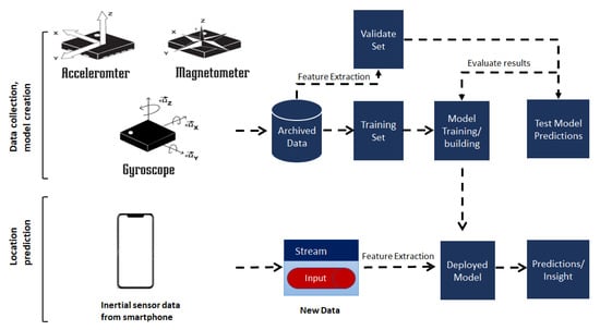 The experimental platform expects the sequence of inertial sensor values, including the accelerometer, gyroscope, and magnetometer from the dataset. The collected values are archived and passed as the training set to build the model. The model expects live stream data from a smartphone. Furthermore, the features are extracted and passed to the model for the prediction of the position.