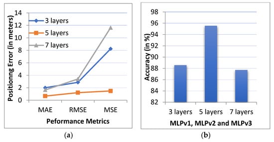 Comparison of: (a) the positioning error (MAE, MSE and RMSE) and (b) the accuracy for the number of the layers of the model.