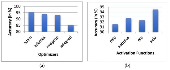 The training data is used in each iteration with fixed hyperparameters. Hyperparameters are the higher-level properties of the data model that improves the performance of the model and conveys the capacity of the model to learn the complexity of the data []. In order to improve the performance of the model, we involved hyperparameters, including several layers, epochs, a mini-batch size, an activation function, a dropout, regularization, and optimizers []. The experimental model was implemented in python, with Keras and TensorFlow libraries with different settings and hyperparameters, as listed in Table 1.