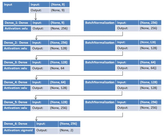 In order to mitigate the effect of unstable gradients with the given neural network, an additional batch normalization layer was introduced to perform an optimization on the input layers. The batch normalization layer works by performing a series of operations on the incoming input data []. For equal distribution amongst the input of the hidden layers and faster convergence, we adopted the batch normalization layer between the hidden layers. The weights of the hidden layer are updated by a reduction in the loss function L, as expressed in Equation (3) using the back-propagation algorithm.