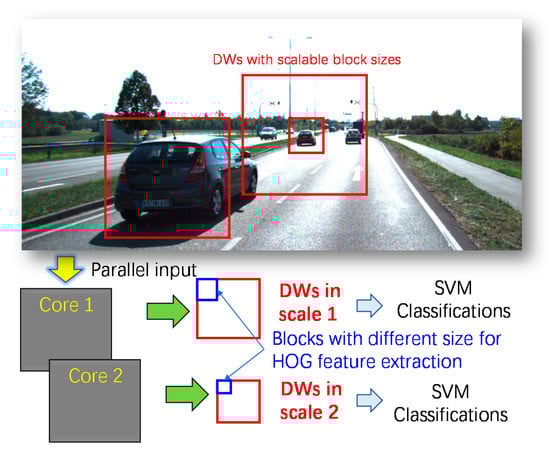 Then, a sliding detection window mechanism with a scalable block size enables parallel partial SVM classifications of all DWs that contain the being-processed block. This can avoid repeated computations of the overlapped blocks in different DWs and large memory for buffering DWs. Compared to the previous FPGA-implemented HOG-SVM classifiers [,,,] with only a dedicated scale, we provide multi-scale detection for vehicle detection in this work.