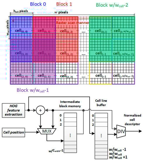 A sliding window is a common approach for object detection []. Classifiers will determine the similarity between the feature vector of the window and samples. A detection window is divided into some local regions (blocks and cells) to calculate feature vectors, while the window is shifting on the image, many cells and blocks are overlapped. One possible solution to avoid overlapping processing is to calculate each cell and use the results to construct the feature vector of blocks and construct a detection window. Meanwhile, feature-vector normalization among a block usually requires dividers. Traditional digital division methods cannot meet the speed requirement. A common way for the fast division is to create a look-up table to store the reciprocal of divisors and convert the division into a multiplication and table-lookup problem.