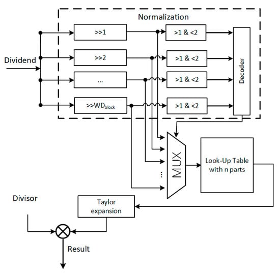 As shown in Figure 4, the normalization unit is to map the dividend into a number within after a bit-shifting. In particular, the look-up-table, in which the number within is divided into parts, determines the accuracy precision of the result. Of course, this is a tradeoff of the result accuracy and the hardware resource.