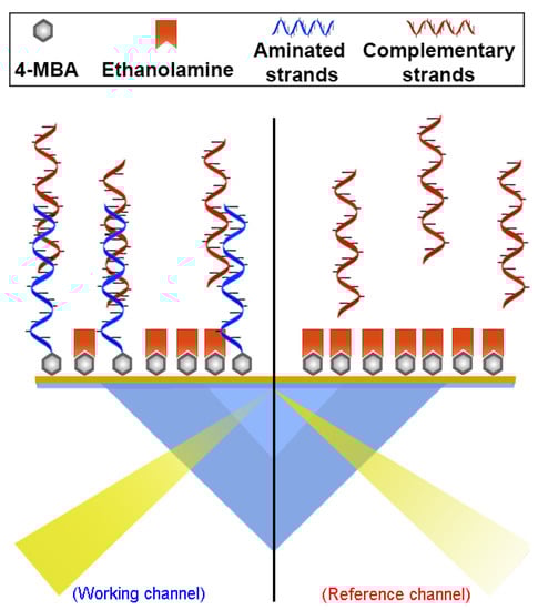 Schematic representation of the biosensor constructed, showing the working channel (left side), composed of a monolayer of 4-mercaptobenzoic acid, aminated thrombophilia strands, and ethanolamine, and the reference channel (right side), composed of 4-mercaptobenzoic acid and ethanolamine, and the interactions with complementary thrombophilia strands.