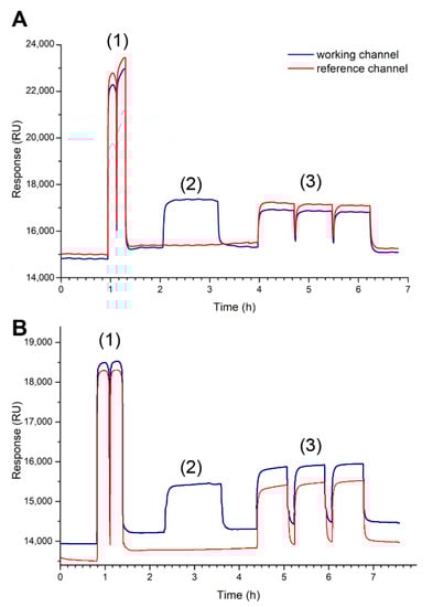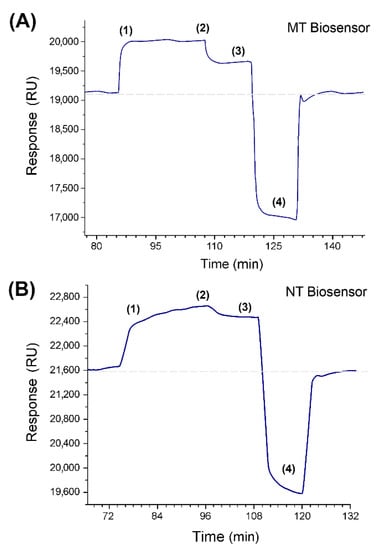 Figure 2 shows the activation, immobilization, and blocking process, for the MT and NT biosensors. Activation of the COOH groups of 4MBA was performed using the EDC/NHS reaction, injected into both channels (working and reference), and the number of modified sites increased after a second injection, with an average change of 757 ± 20 RU (n = 10).
