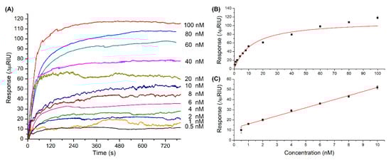 Figure 4 shows the response graphs of the MT biosensor. Figure 4A corresponds to the association curves obtained at different concentrations of MT-C from 0.5 to 100 nM at 25 °C and pH 7.5. Figure 4B corresponds to the plot of concentration versus response (n = 4), with increasing concentrations of MT-C; the response increases gradually and consistently to a Langmuir adsorption isotherm with one binding site [,]. A linear range was determined between 1.0 and 10 nM, with a correlation coefficient R2 of 0.99 (Figure 4C). The sensitivity of the system determined from the slope of the calibration curve was 4.0 ΔμRIU/nM (±0.1) (see calculations and values obtained in Table S3, in the Supplementary Materials).