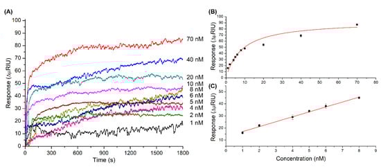 Figure 5 shows the response graphs of the NT biosensor. The association curves obtained at 25 °C and pH 7.5 ranged from 1.0 to 100 nM (Figure 5A). The concentration versus response obtained was graphed (n = 4) (Figure 5B) and is also consistent with a Langmuir adsorption isotherm with one binding site [,]. The linear range was determined between 1.0 and 8.0 nM, with an adjustment of R2 of 0.99 (Figure 5C). The sensitivity of the system determined from the slope of the calibration curve was 4.1 ΔμRIU/nM (±0.1) (see calculations and values obtained in Table S4, in the Supplementary Materials).