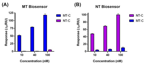 (A) Graph of the response of complementary (MT-C) versus noncomplementary strands (NT-C) in the MT biosensor and (B) graph of the response of complementary (NT-C) versus noncomplementary strands (MT-C) in the NT biosensor. The concentrations studied were 10, 40, and 100 nM, with n = 4.