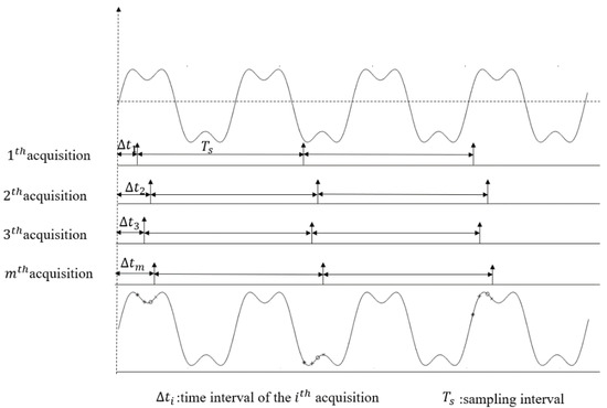 In SES process [8], each period of a signal with a period of is equally divided into n parts. Obviously, the time interval . At time , the mth sampling is performed by shifting the sampling time of each cycle backward by . In the above sampling process, due to the sampling interval , it does not satisfy the sampling theorem. But after mth of sampling, we can get a complete period waveform by rearranging the sampling points in one cycle.