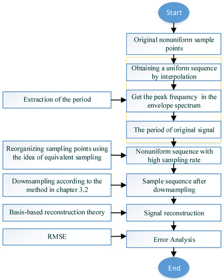 The development of equivalent sampling technology breaks through the limitation of Nyquist sampling theorem. It can sample the signal at a rate much lower than the Nyquist sampling rate while retaining the information of the original signal [8,9]. As a basic method of equivalent sampling technology, random equivalent sampling (RES) is widely used in signal sampling because of its low cost and high accuracy [10,11]. The basic idea of RES is to reconstruct the multi-cycle samples in a fast, equivalent period. However, due to the randomness of the time interval between the trigger position and the sampling clock, the sample distribution is not uniform. In order to obtain a sufficiently high reconstruction accuracy, the RES must undergo a large amount of random sampling to reconstruct the original signal [12]. This multiple sampling will generate a large number of redundant samples which will greatly reduce the reconstruction efficiency. In this paper, by extracting the period of the signal to be reconstructed, the principle of equivalent sampling is used to recombine multi-period nonuniform samples within one period to improve the sampling rate. However, the distribution of the reorganized sample points is still uneven. To solve this problem, we need to utilize the theory of nonuniform reconstruction.