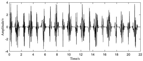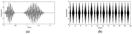 In order to simulate the characteristics of this movement, the simulation vibration signal is now constructed as follows. Two sinusoidal signals with frequencies of 70 Hz and 15 Hz are used to simulate different frequency components in the signal. Due to the influence of the robot’s speed in the first and third stages of the robot arm’s movement, the robot arm should exhibit a relatively obvious amplitude modulation phenomenon on the waveform. A sine wave with a frequency of 2 Hz and 1 Hz is used as the modulation signal to simulate this phenomenon. Suppose the period of the robot arm movement is , and the time that the robot arm stays at the initial position and the end position is 0.4 s and 0.3 s, respectively. The simulation waveform of one movement cycle of the robot arm is shown in Figure 3a. Then the signal is periodically extended to obtain a signal of 10 cycles, the signal after the extension is as shown in Figure 3b.