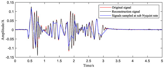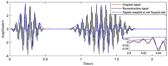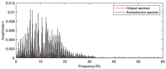 The last step is to bring samples selected into the reconstruction function and obtain the reconstructed time-domain waveform. In order to show the quality of the reconstruction effect more intuitively, the time-domain comparison chart (Figure 13) and frequency-domain comparison chart (Figure 14) are given.