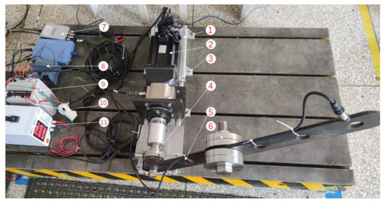 The current signal collected from the arm swing test stand is used to verify the effectiveness of the proposed method. As shown in Figure 8, the structural part of the stand is composed of base, servo motor, reducer, bearing seat, swing arm and other components. For the control part, Siemens PLC is applied to implement the periodic reciprocating movement of the robot arm swing. The size of the weights and its installation position on the swing arm can be adjusted to simulate the change of load. The function of the test stand is to collect the current and vibration signals of the swing arm in the whole life test process to study the decline characteristics of the reducer. The current signal is collected by the NI9234 acquisition card with a sampling rate of 256 Hz and the period of swing movement is 5 s. The names of all components of the test stand are given in Table 1.