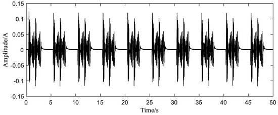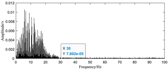 As in simulation, we take 10 full-cycle current signals (Figure 9), and then obtain the initial nonuniform sample sequence for reconstruction by down sampling the original data. The number of sampling points is 1000. By observing the spectrum of the original signal, it can be seen that the highest frequency of the signal is around 30 Hz, as shown in Figure 10. Therefore, the average sampling rate 20 Hz still satisfies the sub-Nyquist sampling rate.