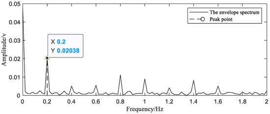 After uniformly resampling through interpolation, we calculate the period of the original signal from the peak frequency in the envelope spectrum of these pseudo sampling points. The envelope spectrum is shown in Figure 5. A period of the original signal contains two similar parts, so the time corresponding to the peak frequency is half of the period of the original signal. The signal period can be obtained according to Equation (11).