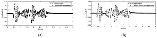 After the period of the signal is determined, according to the corresponding positions of the sampling points in their respective periods, they are transferred to the first period. The new time position is determined by Equation (8). In order to avoid the failure of reconstruction caused by the distance between the sampling points, the sample point with the smallest deviation from a uniformly distributed sequence are selected from all the regrouped samples. The highest frequency of the simulation signal is 70 Hz. Theoretically, as long as the average sampling rate is greater than or equal to 140 Hz, the original signal can be recovered. After recombining 1200 points of 10 cycles into one cycle (Figure 6a), there are a lot of redundant sampling points. As shown in Figure 6b, 340 nonuniform sample points closest to the uniform time series are selected out from 1200 samples to ensure the distribution of nonuniform samples and to discard those points with very close or far spacing.