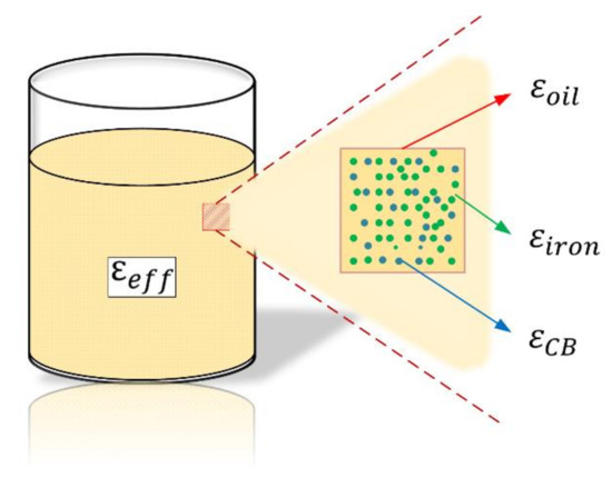 where is the equivalent dielectric constant of the mixed medium; is the dielectric constant of pure oil; and are the dielectric constants of the carbon black (CB) and iron, respectively; and are the volume fractions of the CB and iron, respectively; and is a fitting parameter whose value depends on the type of mixture.