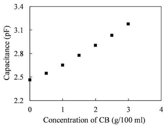 Therefore, the average capacitance increment for carbon black was 0.24 pF per 1 g/100 mL variation in concentration. The higher the amount of carbon black in the processing oil, the higher was the output voltage of the capacitive sensor. Thus, the equivalent dielectric constant increased with the carbon black concentration.