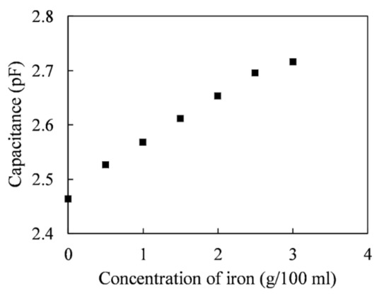 The capacitance values of iron powders at different concentrations are plotted in Figure 6. The capacitances were measured by adding different weights of iron to 100 mL of EDM oil. When the iron concentration was 0.5 g/100 mL, the capacitance was 2.53 pF. When the iron concentration increased to 3 g/100 mL, the capacitance value increased to 2.72 pF. Therefore, the capacitance increment of the iron particles over the measured contamination concentration range was 0.087 pF per 1 g/100 mL.