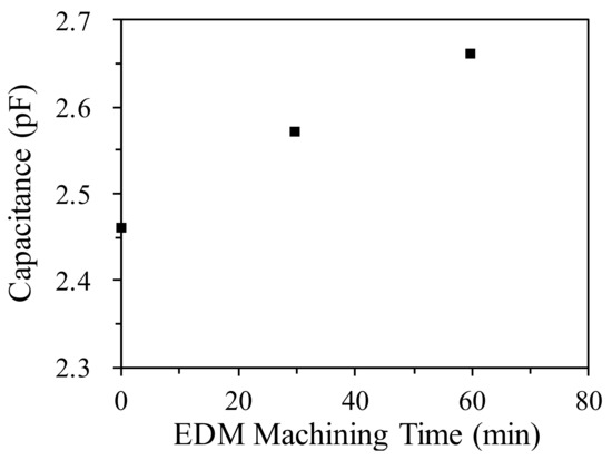 The change in the level of oil contamination during EDM was also measured in this study. SS41 low-carbon steel was processed in a processing tank, as shown in Figure 7. The capacitance value was recorded as processing time increased (Figure 8). The capacitance was positively correlated with the concentration of the processing oil. The capacitance of the pure processing oil before processing was 2.46 pF. After 60 min of machining, the equivalent capacitance of the oil increased to 2.66 pF. The equivalent capacitance of the sensor increased with the processing time.