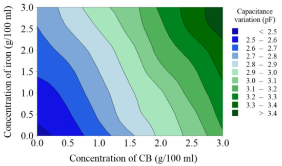 In Figure 9, the horizontal axis (X) represents the concentration of carbon black particles in grams per 100 mL of processing oil, the vertical axis (Y) represents the concentration of iron particles in grams per 100 mL of processing oil, and Z represents the capacitance increments. The color blocks of the contour map represent different capacitance measurement results. The linear fitting coefficients indicate that the rising trend of capacitance for CB particles is faster than that for iron particles.
