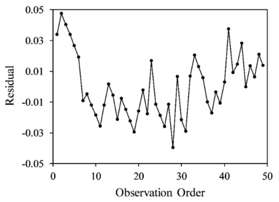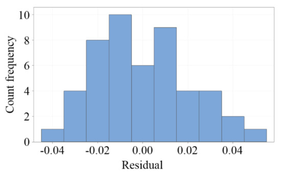 A residual analysis was performed to determine the difference between the fitted predicted value and the actual measurement data. Figure 10 presents a histogram composed of the number of residual occurrences; it can be used to statistically observe whether the residuals have a normal distribution. Figure 11 plots the correlation between the residuals and the experimental order, which indicated that the residuals satisfied independent assumptions, and that the experimental results were not easily affected by time changes.